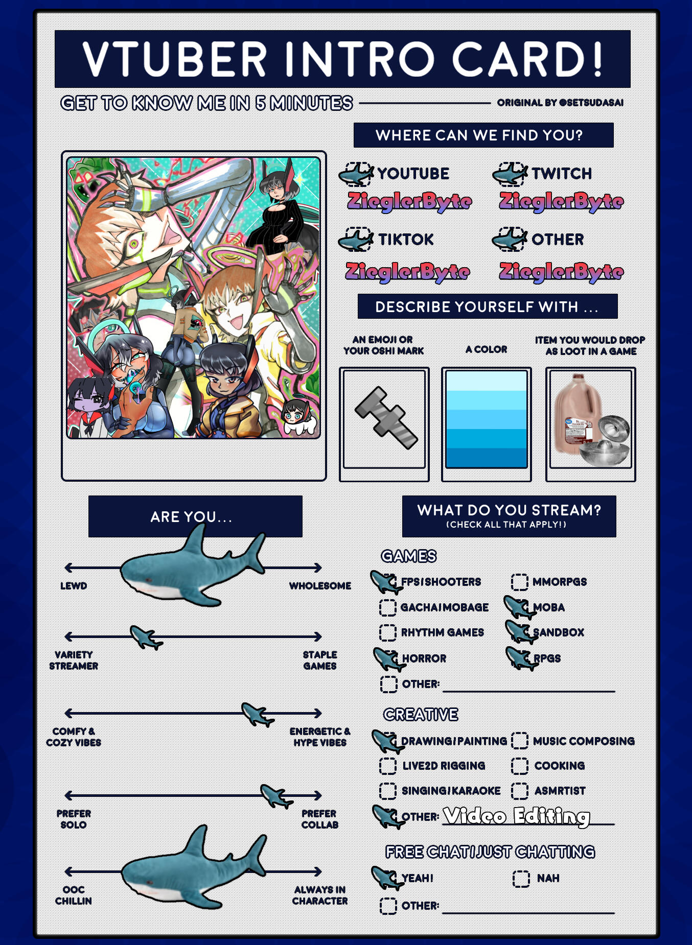 I'm Taylsor, though you can call me Tay or Taylor if you like. I am a male, Cyborg VTuber. I stream a variety of games and genres with a nice comfy vibe. You can expect plenty of chat interaction during most streams!
